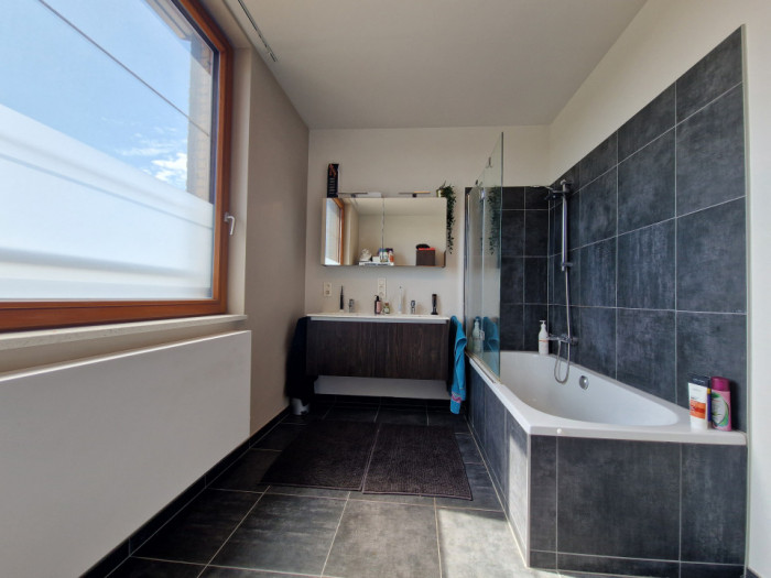 Extra uitrusting : geïnstalleerde lichtarmaturen | kaderrails | sunscreens aan alle ramen | parket in inkomhal, woonkamer en slaapkamers | inbouwkasten in de slaapkamer.