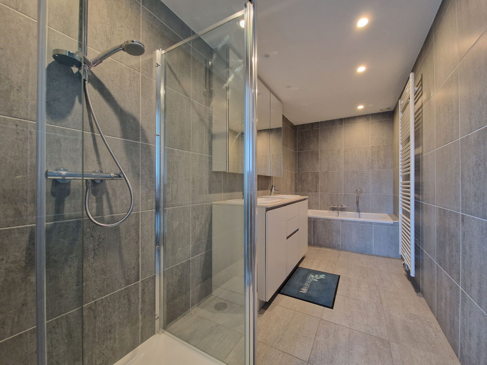 Het appartement gelegen op de tweede verdeiping omvat o.a. : hal | apart gastentoilet | ingebouwde vestiairekast | living met toegang tot terras | volledig uitgeruste open keuken met o.a. eilandblok + ingebouwde oven, vaatwasser, microgolfoven, koelkast + keramische kookplaat | 1 grote berging | aparte wasplaats | 1 slaapkamer met aanpalende badkamer: ingerichte badkamer met dubbele lavabo en meubel, ligbad, douche en ingebouwde spots | privatieve kelder | 2 privatieve fietsenstaanders