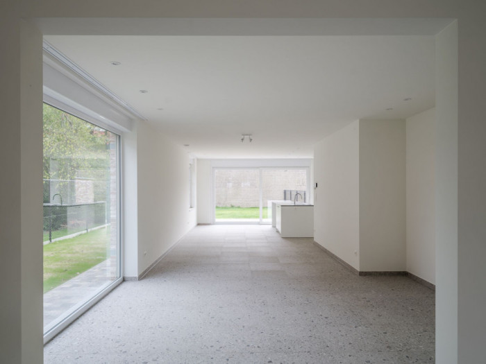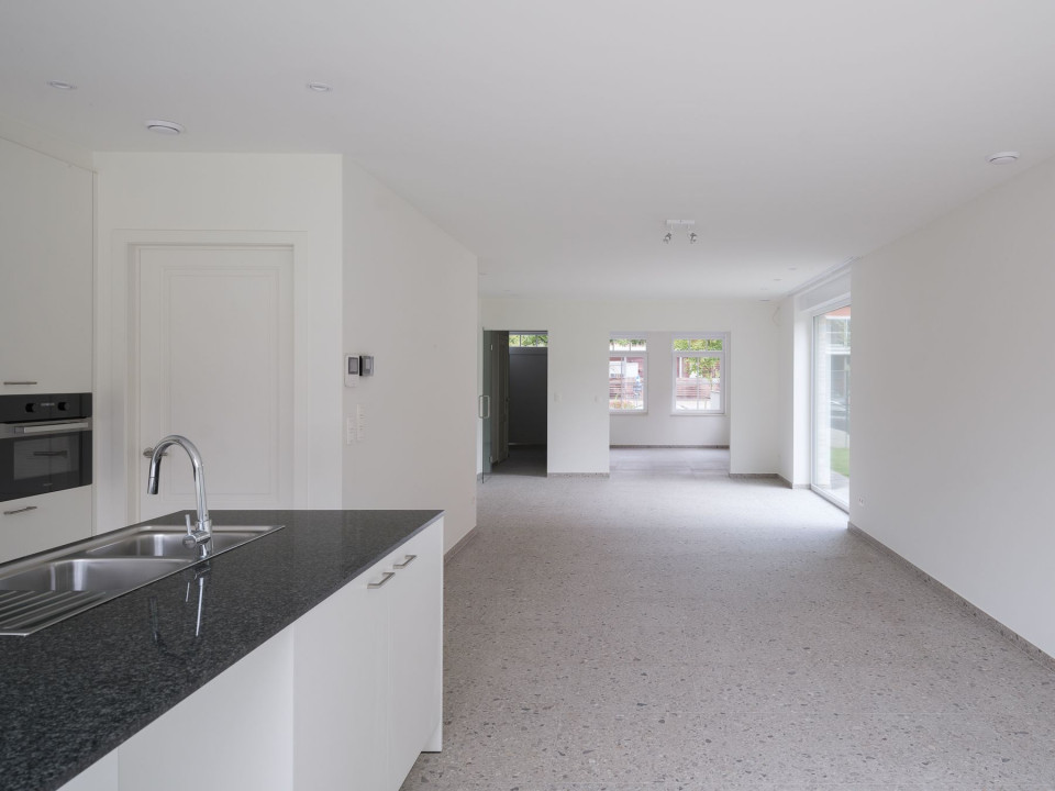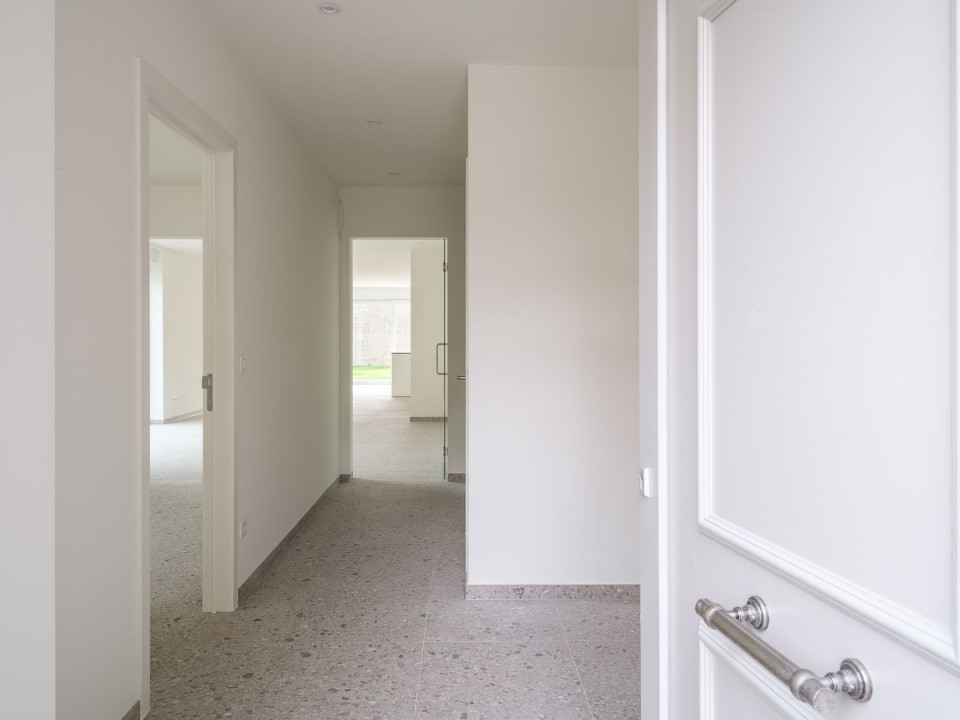 Binnenin zorgt de ruime inkomhal voor een hartelijke ontvangst. Aansluitend vind je een handige bureauruimte en een gastentoilet. De lichtrijke leefruimte vormt samen met de luxueus ingerichte open keuken – uitgerust met Miele-toestellen – het warme kloppende hart van de woning, met een mooi uitzicht op de tuin. Verder is er een aparte wasplaats en een ruime garage met automatische poort.