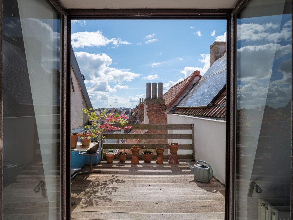 2de en 3de verdieping ( 100 m² ) : woonkamer - keuken - 2 slaapkamers- badkamer en douche - 2 toiletten - zonneterras