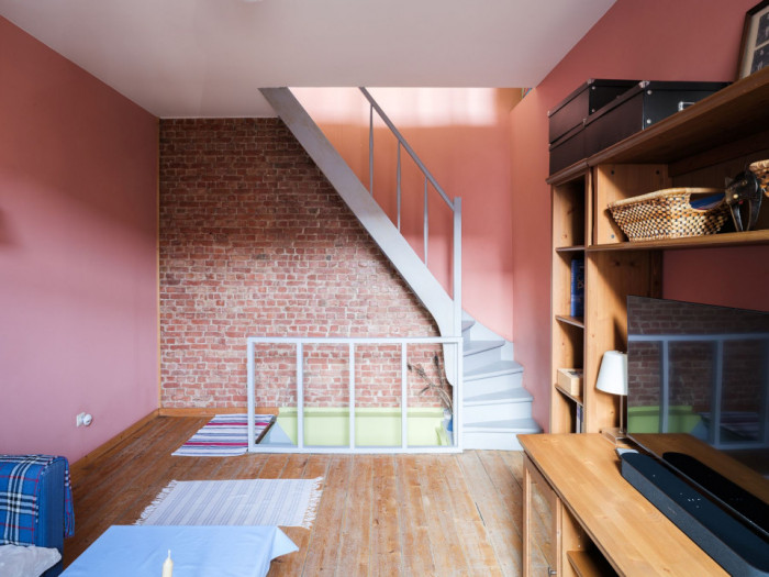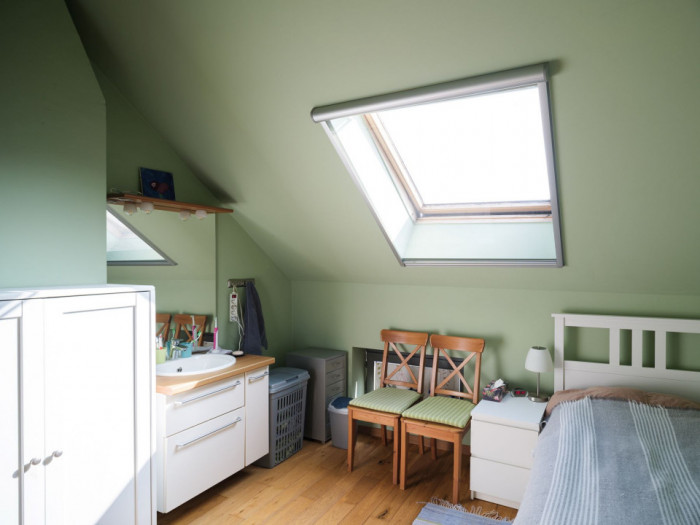 De tweede verdieping herbergt een ruime slaapkamer met lavabo, waar opnieuw de houten vloer en de overvloedige lichtinval bijdragen aan het comfort en de charme van de woning.