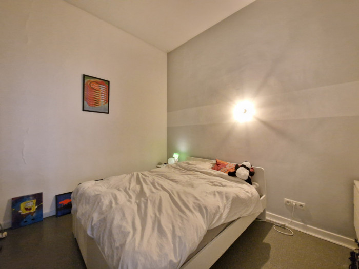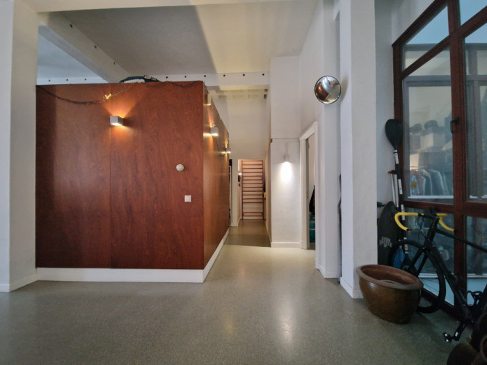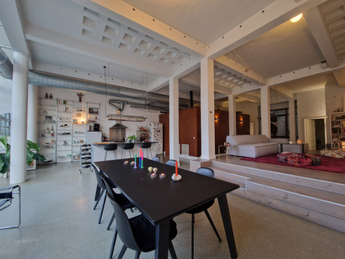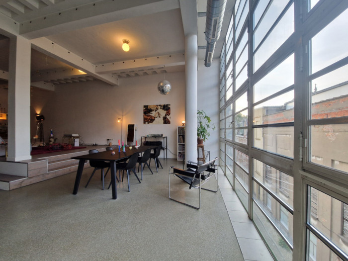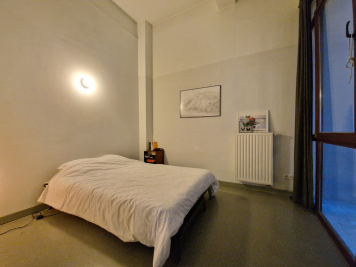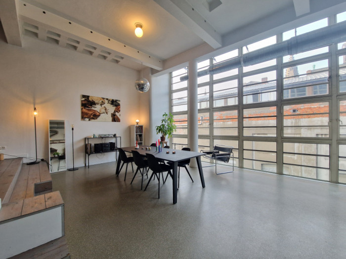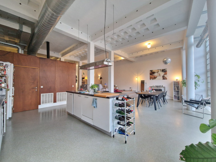 Bij het betreden van het appartement word je meteen verwelkomd door een uitzonderlijk ruimtelijk gevoel, dankzij de indrukwekkend hoge plafonds die het geheel een open en luchtige sfeer geven. De ruime woonkamer, ingericht in echte loftstijl, is voorzien van een verhoogd podium dat perfect dienst kan doen als gezellige leeshoek, werkruimte of multimediaroom. Deze originele indeling geeft de leefruimte een uniek karakter.