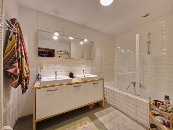 Verder beschikt het appartement over twee volwaardige en ruime slaapkamers, ideaal voor een koppel of wie graag een aparte werk- of logeerkamer voorziet. De stijlvolle badkamer is uitgerust met een ligbad, dubbele lavabo en strakke afwerking, wat zorgt voor een gevoel van comfort en luxe.